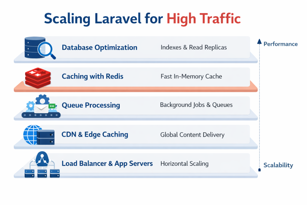 In reality, scaling Laravel for high traffic is about removing bottlenecks layer by layer.