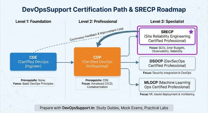 | SRE | SRE Certified Professional (SRECP) | Professional | SREs, DevOps, SysAdmins | Linux, Git, CI/CD | SLOs, Error Budgets, Monitoring, Toil | After CDP |